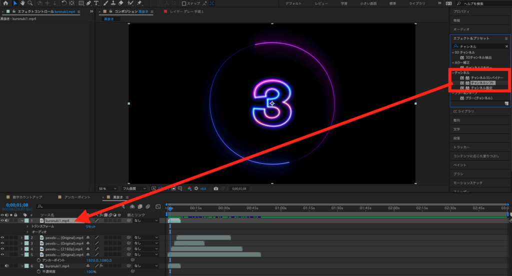 Step1 黒抜きしたい動画に「チャンネルコンバイナー」のエフェクトを使用する