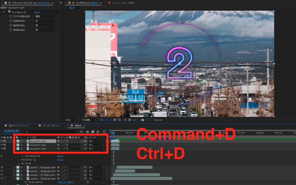 まず一つ目に紹介するのはエフェクトの「チャンネルコンバイナー」と「カラーマットの削除」を組み合わせる方法です。早速手順を紹介します!