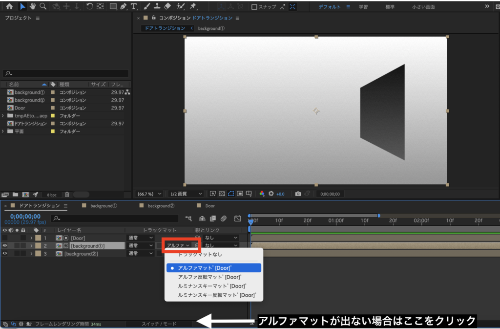 先ほどと同様に、切り替わり後の背景と扉のコンポジションをコピー&ペーストし、今回は「アルファマット