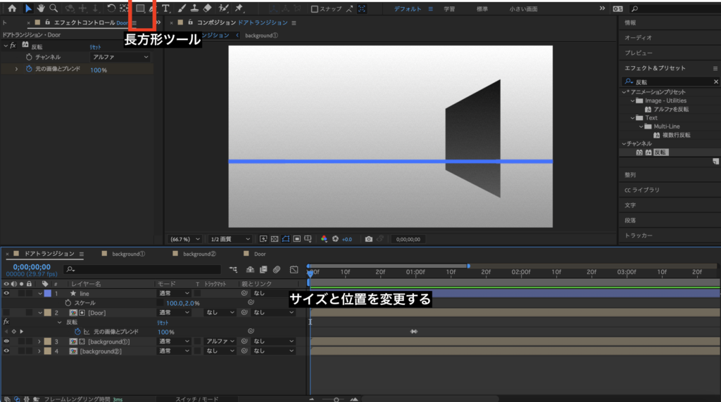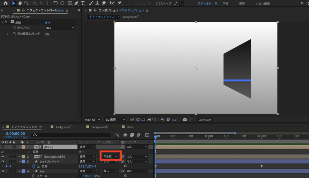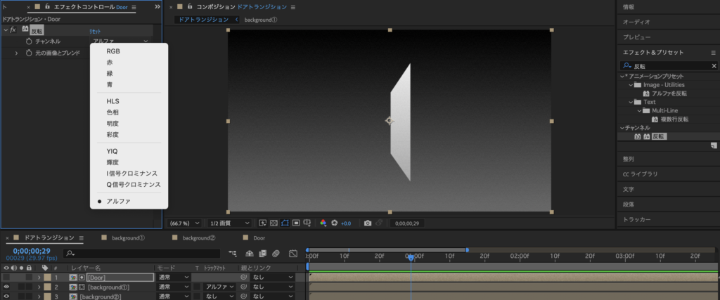 ③エフェクト&プリセットで、「反転」と検索し、「反転」のエフェクトを扉のコンポジションにかけます。
