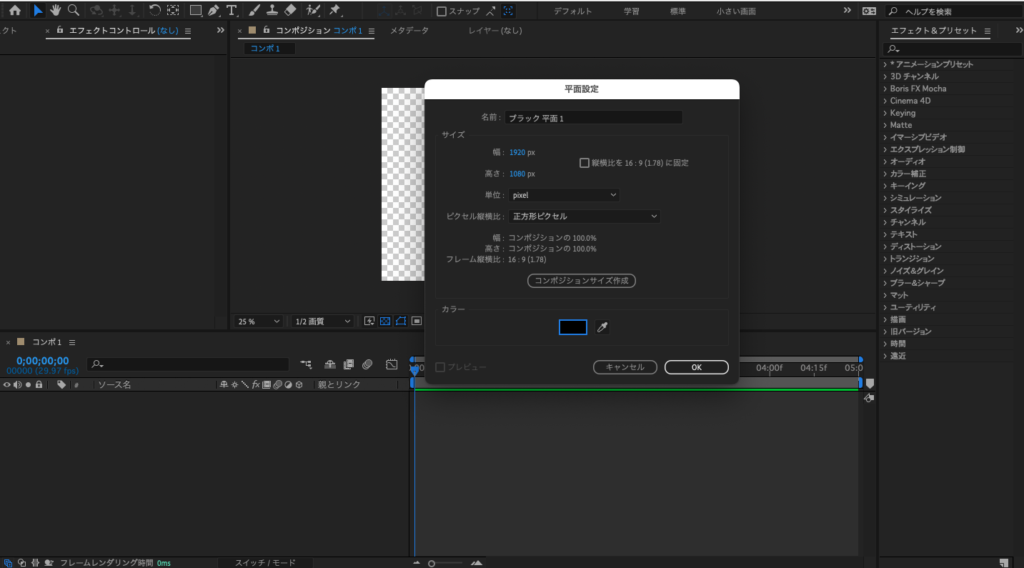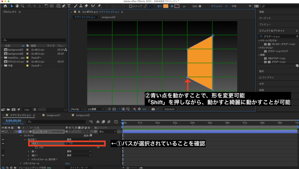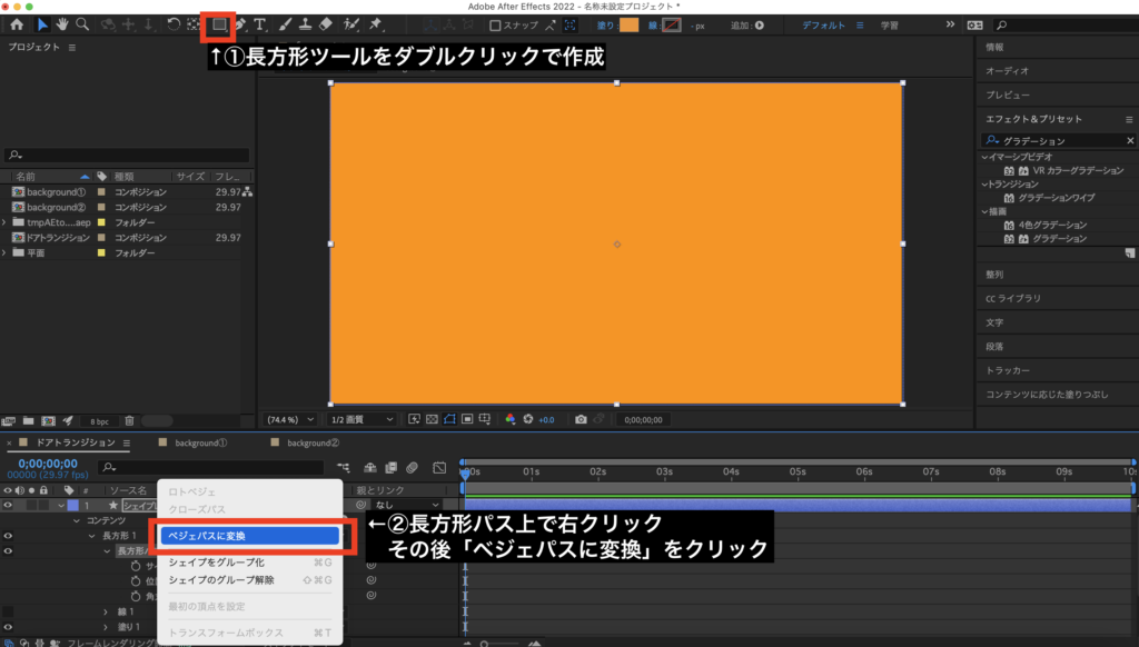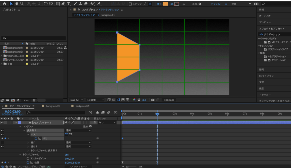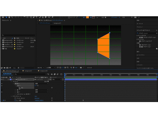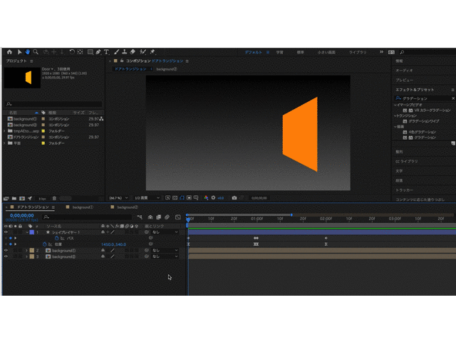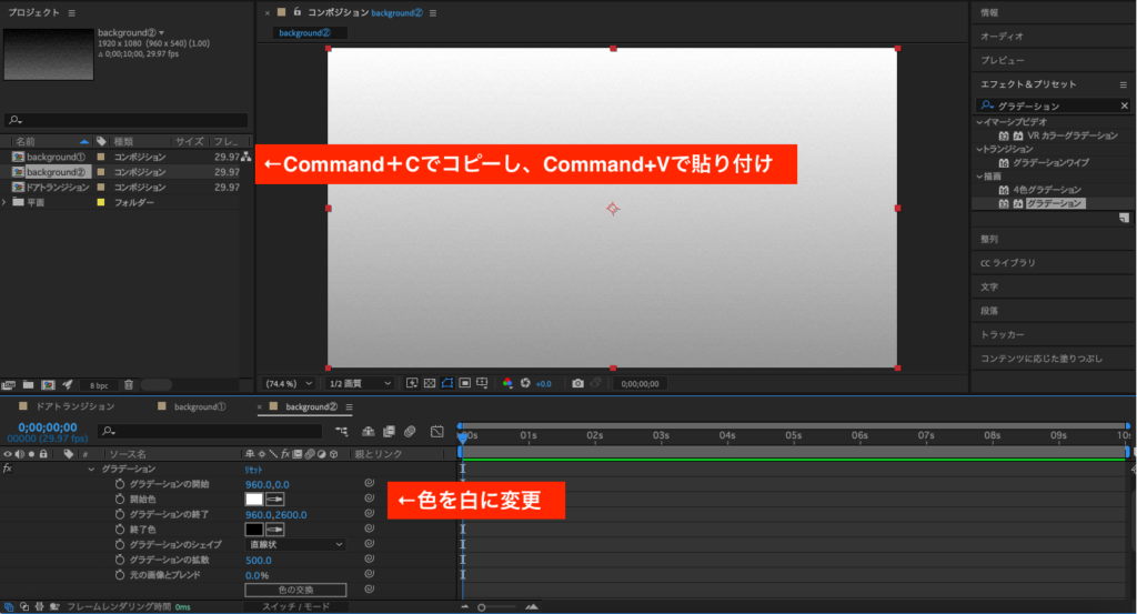 ②背景の色はエフェクト&プリセットの中の、グラデーションで調整をします。