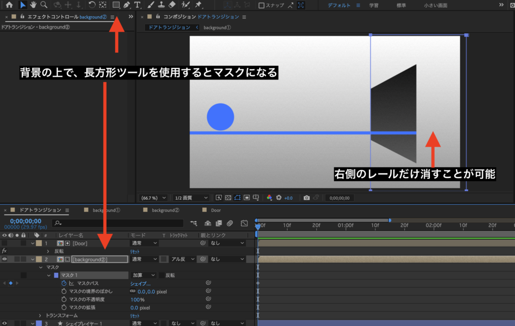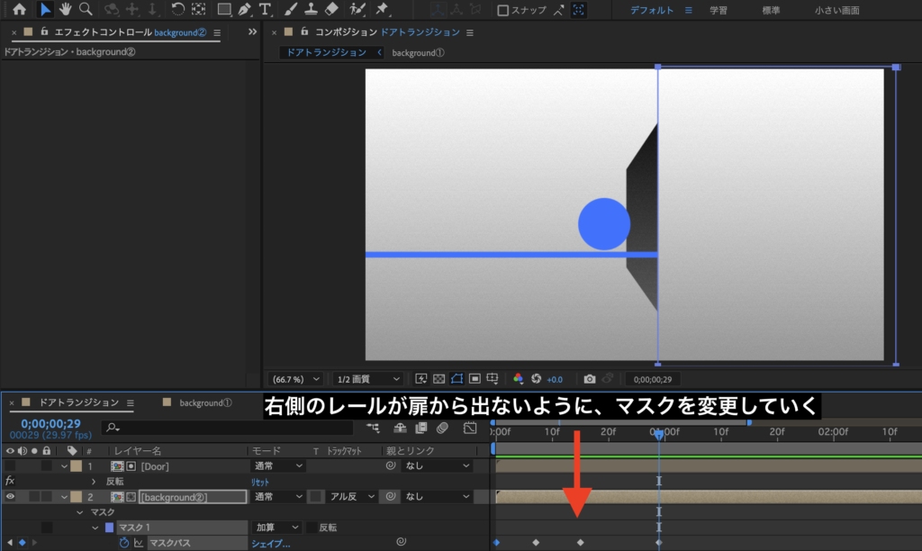 ④時間を動かしていくと、レールが扉からはみ出してしまうので、マスクパスにキーフレームを打ちマスクのパ