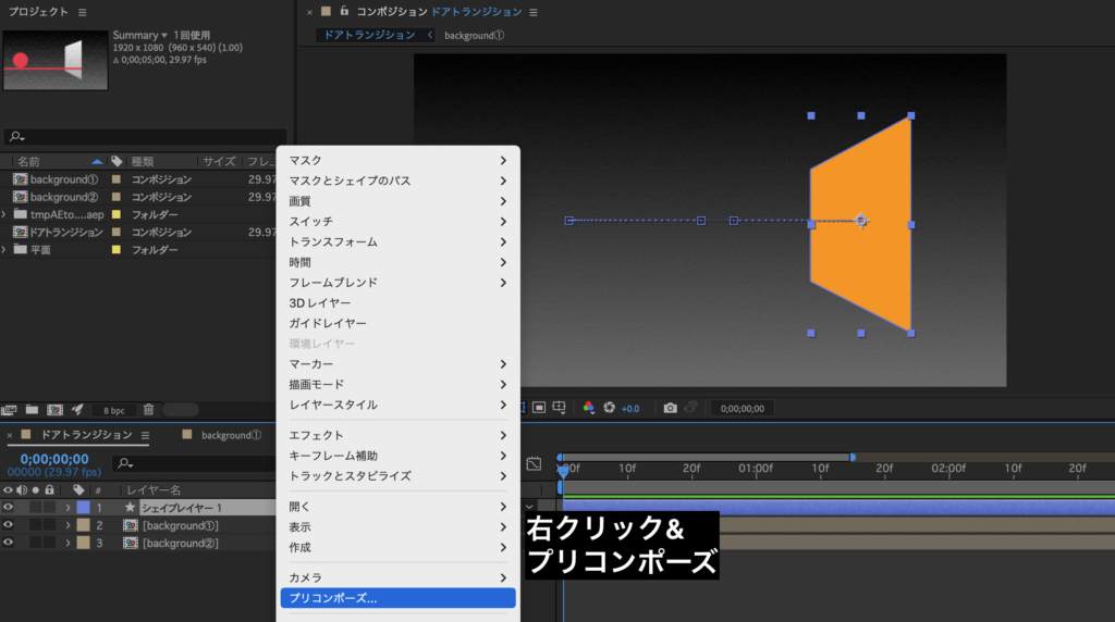 ①手順2で作成した、扉のシェイプレイヤーを右クリックし、プリコンポーズを選択します。