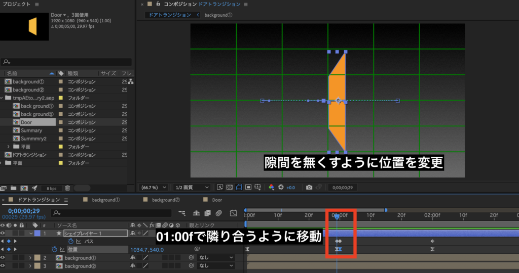 まず、0~1秒の背景(今回であれば白)と扉のコンポジションをCommand+Cでコピーし、Command+Vで貼り