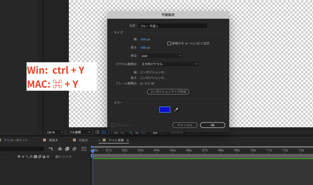 新しく平面レイヤーを作成します。この際のカラーは色が決まっている場合はその色に設定します。