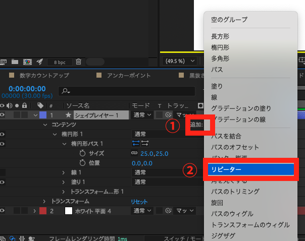 できたシェイプレイヤーのコンテンツから追加▶️を押して、リピーターを選択します。