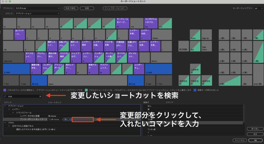 変更したい部分をクリックして、好きなコマンドを入力することで、ショートカットを検索することができます。