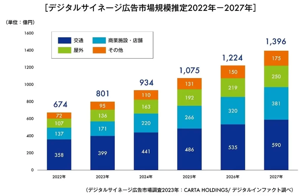 デジタルサイネージ広告市場を調べた調査によると、交通分野や商業施設での市場規模が上がっていきそうです。
