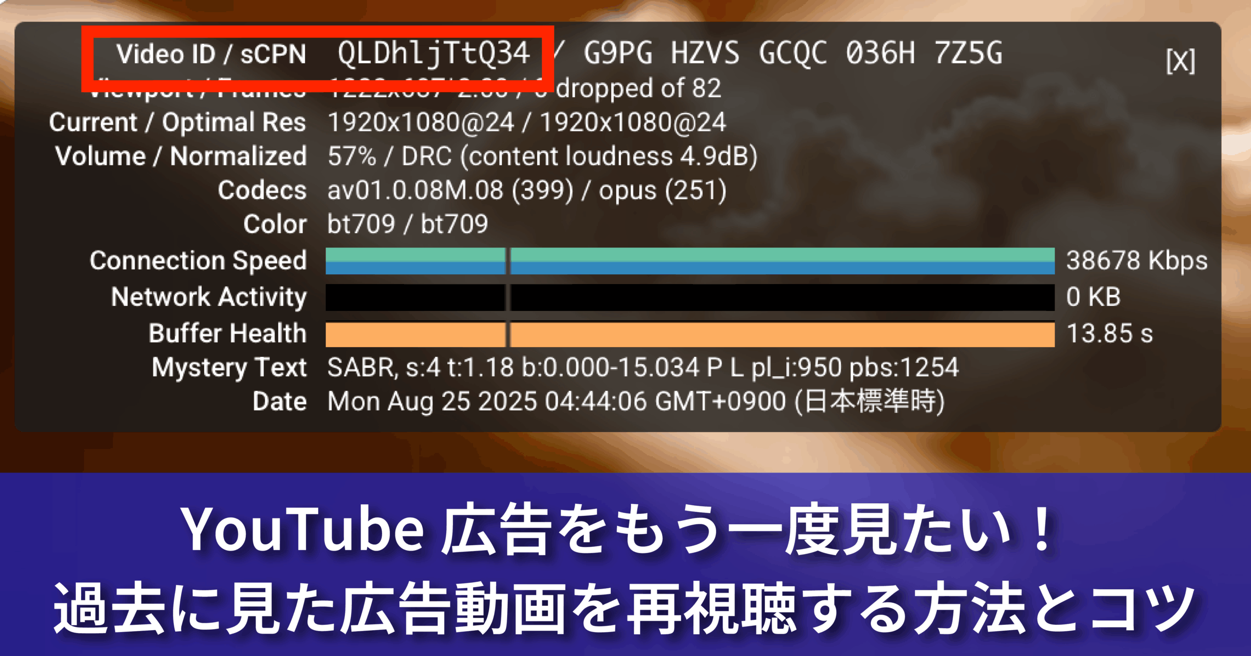 右クリックで詳細統計情報を開くと、動画上に英数字の統計データのオーバーレイが表示されます。項目の中に「Video ID / sCPN」と書かれた行があり、そのスラッシュより前にある英数字の文字列がその動画のIDです。