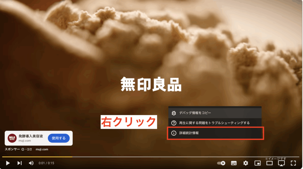 広告動画が再生されて「もう一度見たい」と思ったら、まず一時停止しましょう。その状態で動画の再生画面上で右クリックし、メニューから「詳細統計情報」をクリックします。